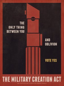 To be fair, while I was generally underwhelmed by the book and the art, there were some pieces I really enjoyed. Examples of Sabine’s graffiti, including a defaced Imperial recruitment poster, are great Rebels references and make sense within the universe; Sabine’s starbird seems to have inspired the Rebel symbol, so there’s logic in highlighting her as an artist. There were also a couple Clone Wars-era posters that both fit within the universe and added some world building depth, such as “The Military Creation Act.” This poster shows the public’s perception of Jedi as guardians of the Republic, but also plays up the idea that the Republic’s only guardians are the Jedi–and the Jedi are not enough. It’s a subtle, layered design, and the description builds up a little more of the Star Wars universe.